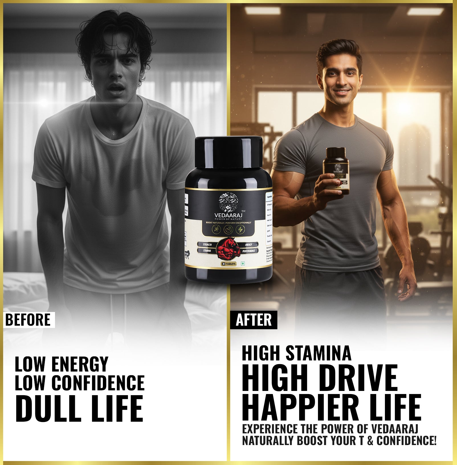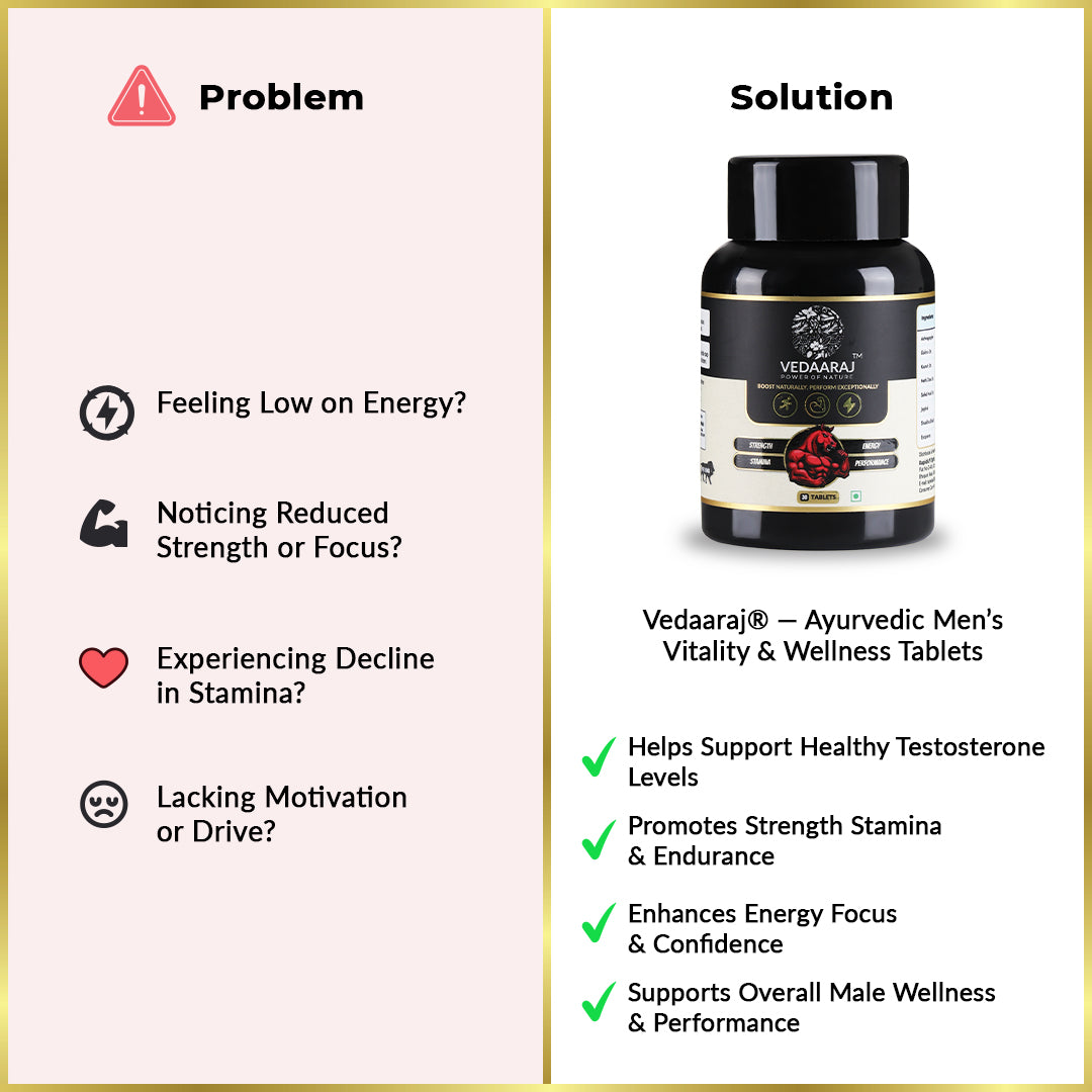 Vedaaraj® Tablets combine ancient Ayurvedic wisdom with modern testing standards to help men improve energy, strength, and endurance safely and naturally.